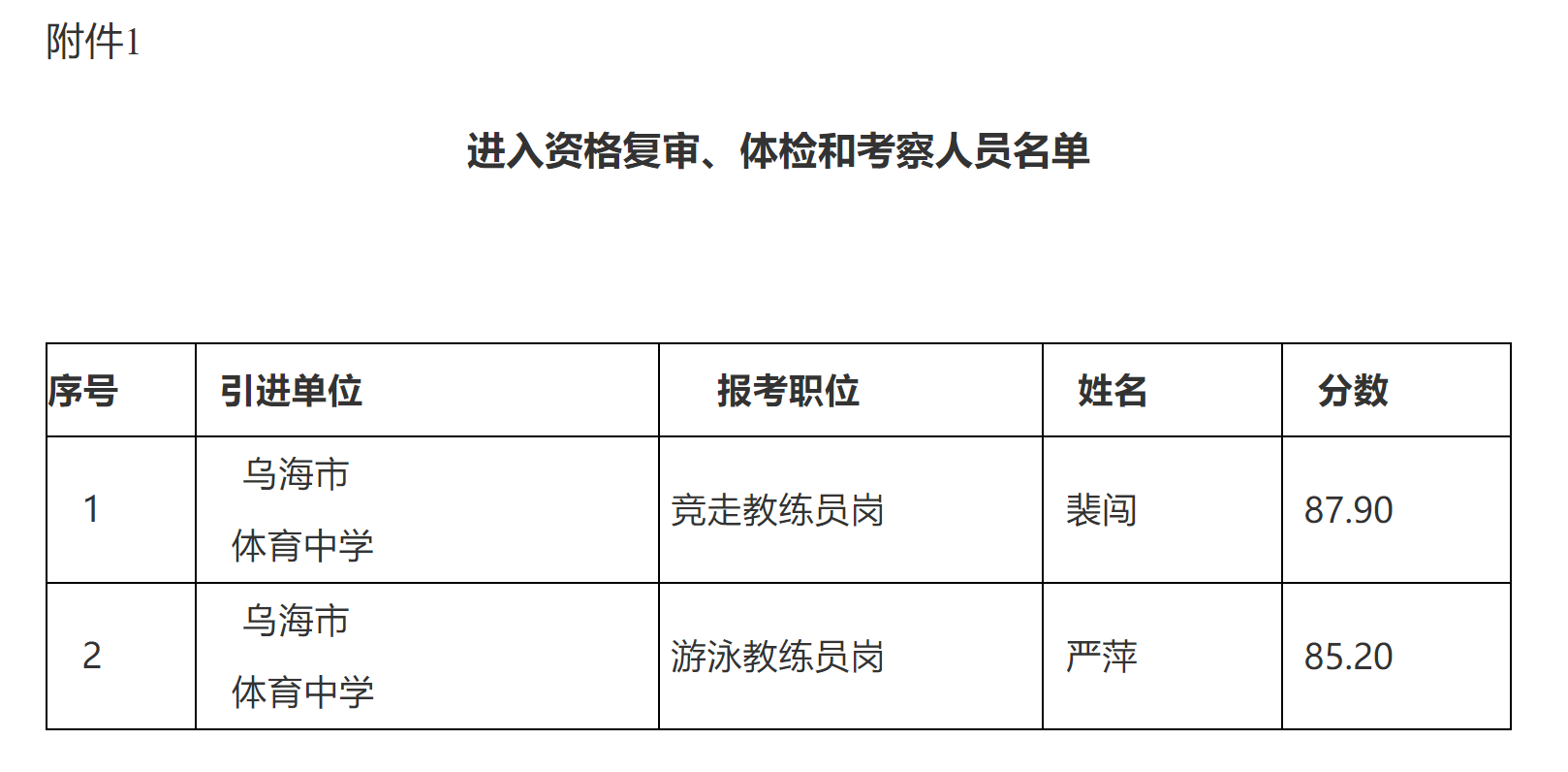 根据《2025年乌海市体育中学高水平教练员引进公告》和《关于开展2025年乌海市体育中学高水平教练员引进试讲工作的公告》,按照每个岗位报考人员面试面谈和试讲成绩由高到低的顺序和岗位需求数量,确定进入资格复审、体检和考察人员名单(附件1)。现将有关事项公告如下: