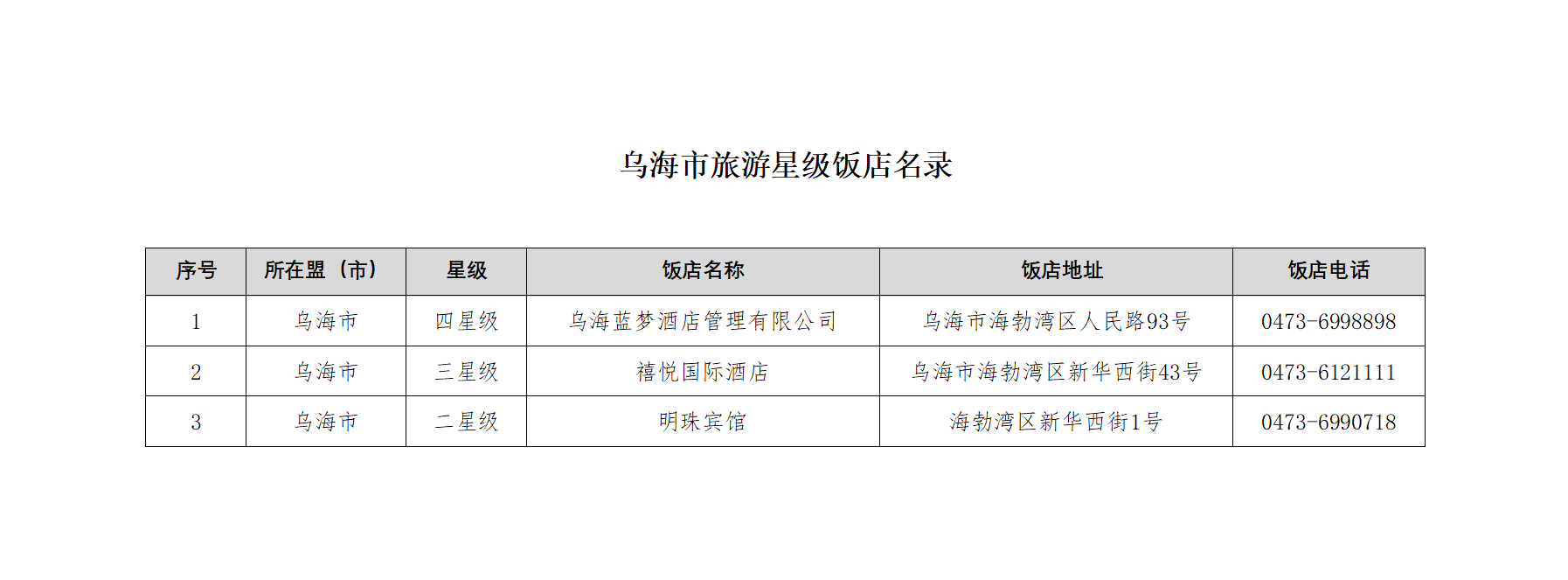 乌海市旅游星级饭店名录