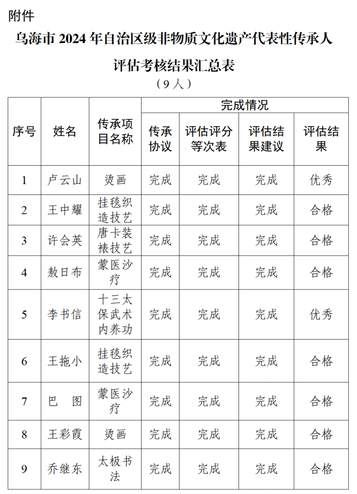 按照《内蒙古自治区文化和旅游厅关于开展国家级 自治区级非物质文化遗产代表性传承人2024年度传承活动评估工作的通知》文件要求,乌海市文体旅游广电局公共服务和非物质文化遗产科、乌海市文化广电事业发展中心联合成立评估小组对乌海市自治区级非物质文化遗产代表性传承人的传承活动进行评估。