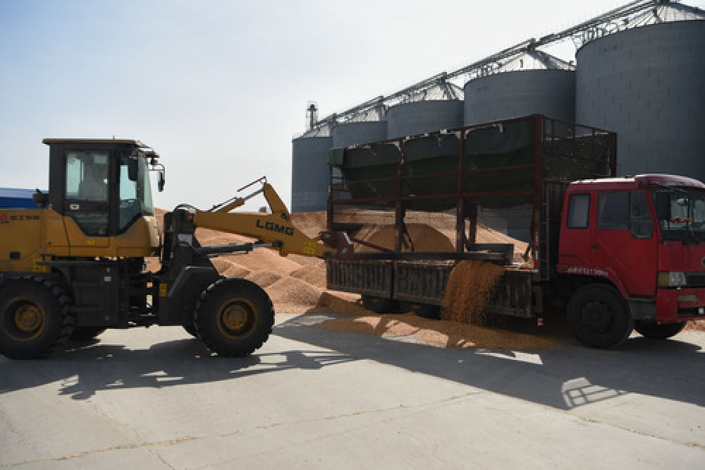 3月12日,在托克托工业园区内的内蒙古融成玉米开发有限公司,工人操作设备卸载玉米原料。新华社发(李志鹏摄)