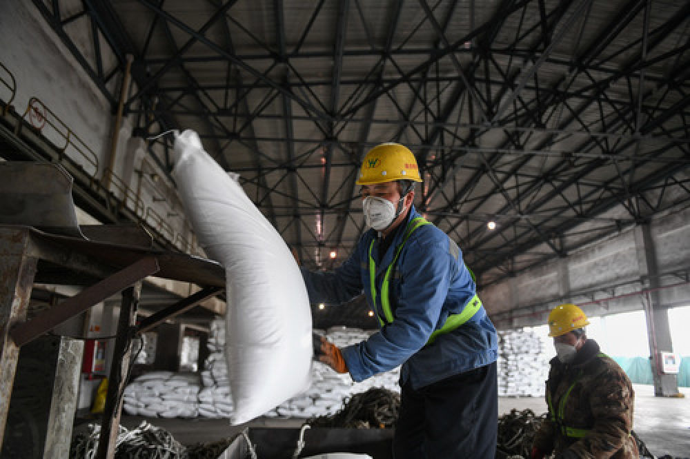 3月14日,工人在内蒙古恒业成有机硅有限公司仓库装卸有机硅产品。