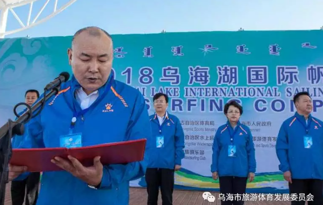 市委常委、政府副市长郭大勇在开幕式中致辞,他指出乌海是一座山水人文之城、一座运动休闲之城。近年来,乌海市体育旅游产业基础设施显著改善,体育组织网络更加健全,全民健身氛围十分浓厚。中国户外城·乌海水陆空体育运动项目的规模和影响力逐年提升,户外运动休闲、体育旅游体验、赛事观摩欣赏已经成为环山湖旅游度假的主要内容和城市的亮丽风景。举办2018乌海湖国际帆板大赛,旨在更好地推动全民健身运动开展,发挥乌海湖四季有风、水域开阔的特点,培育乌海湖水上运动品牌赛事,推动风帆运动在内蒙古地区的推广。