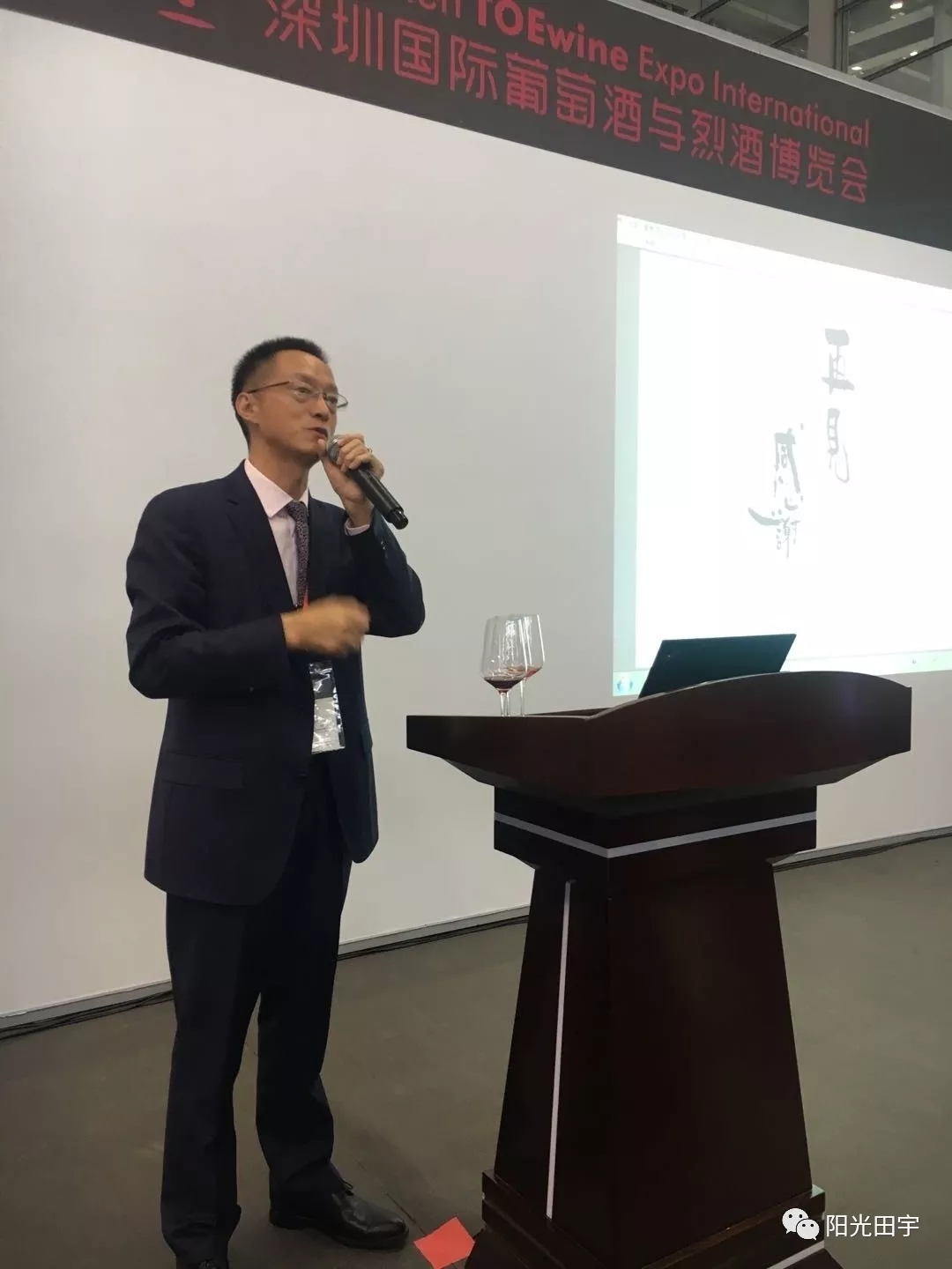 2018年10月12日,在深圳会展中心。中国2018深圳国际葡萄酒与烈酒博览会拉开帷幕。由深圳市创业时代会展有限公司主办,中国葡萄酒协会联盟、深圳市葡萄酒行业协会协办的“消费论坛-美酒与美好生活”论坛上阳光田宇黄建清总经理将阳光田宇自然酒进行了介绍和品评。