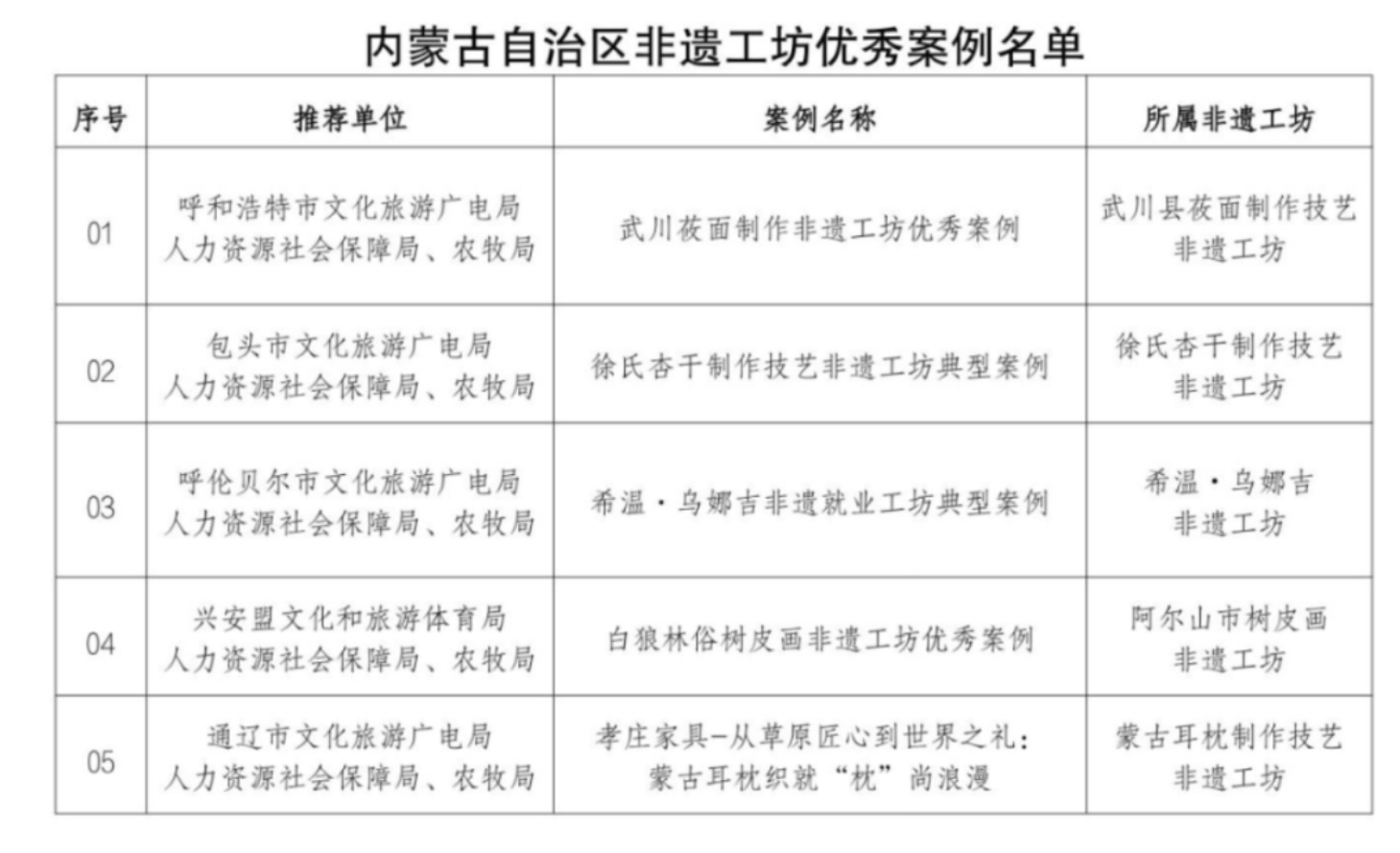 根据《内蒙古自治区文化和旅游厅 人力资源和社会保障厅 农牧厅关于推荐“自治区级非遗工坊优秀案例”的通知》安排,文化和旅游厅、人力资源和社会保障厅、农牧厅组织开展了“非遗工坊优秀案例”推荐工作,在各地积极申报的基础上,经专家评审,评定武川莜面制作非遗工坊案例等13个优秀案例,现予以公示。