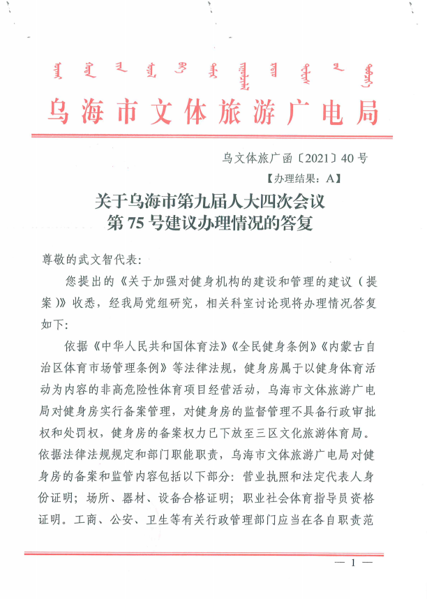关于乌海市第九届人大四次会议第75号建议办理情况的答复