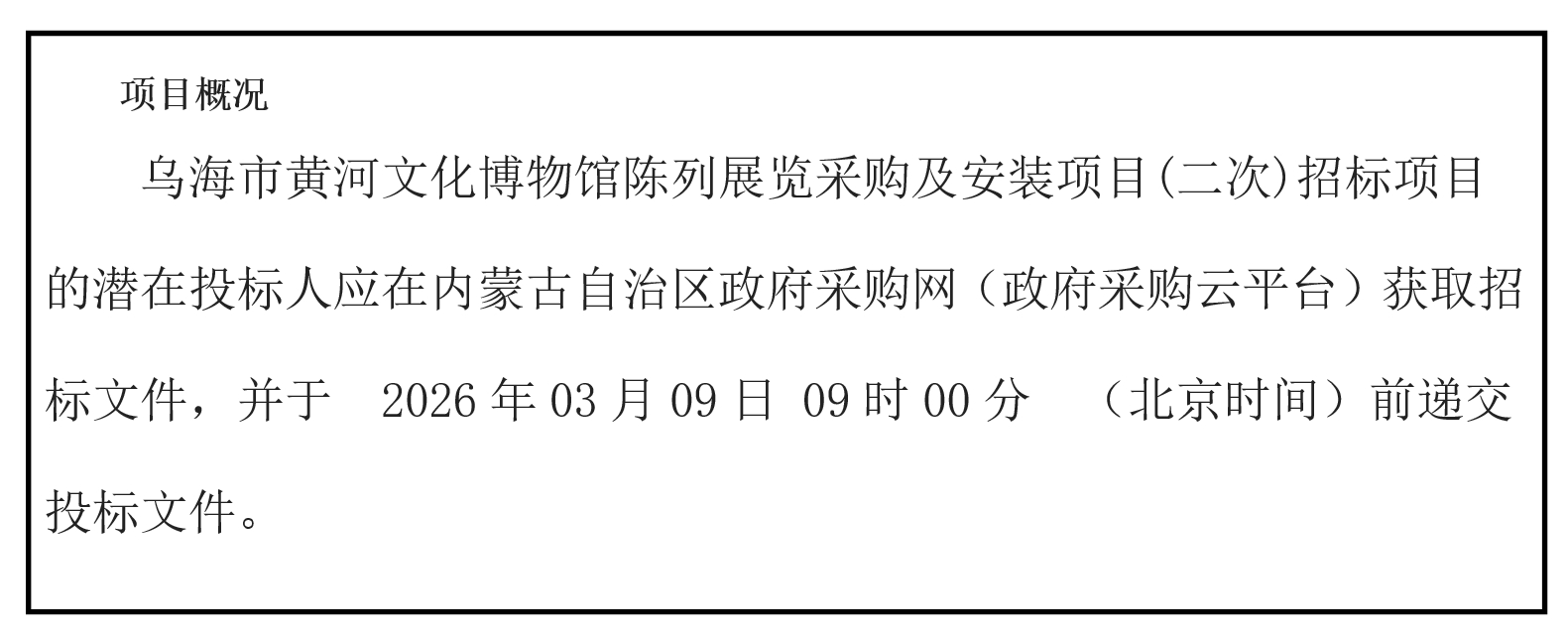 乌海市黄河文化博物馆陈列展览采购及安装项目(二次)招标项目的潜在投标人应在内蒙古自治区政府采购网(政府采购云平台)获取招标文件,并于 2026年03月09日 09时00分 (北京时间)前递交投标文件。